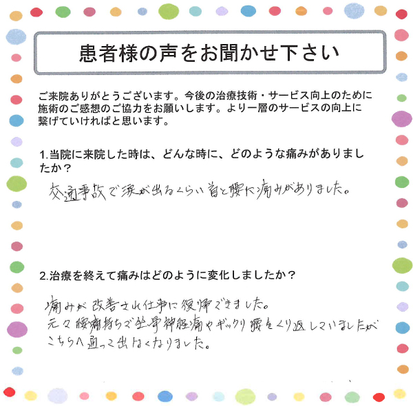 交通事故で涙が出るくらい首と腰に痛みがありました。