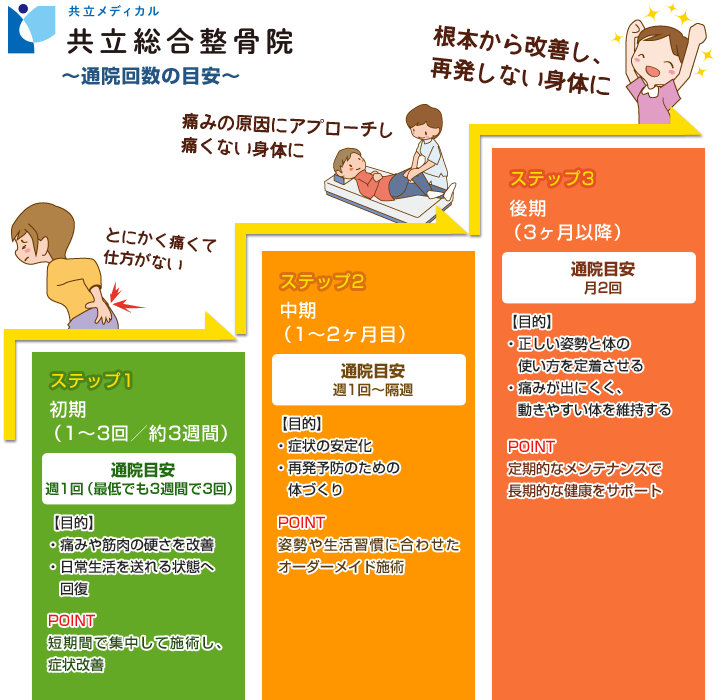- 共立総合整骨院では日本古来の整体と理学療法を使った施術になります。患者様の症状に合わせてスタッフが施術メニューを組み立てます。 今ある痛みを取り除くことはもちろん、痛みの出にくい身体作りをしていきます。